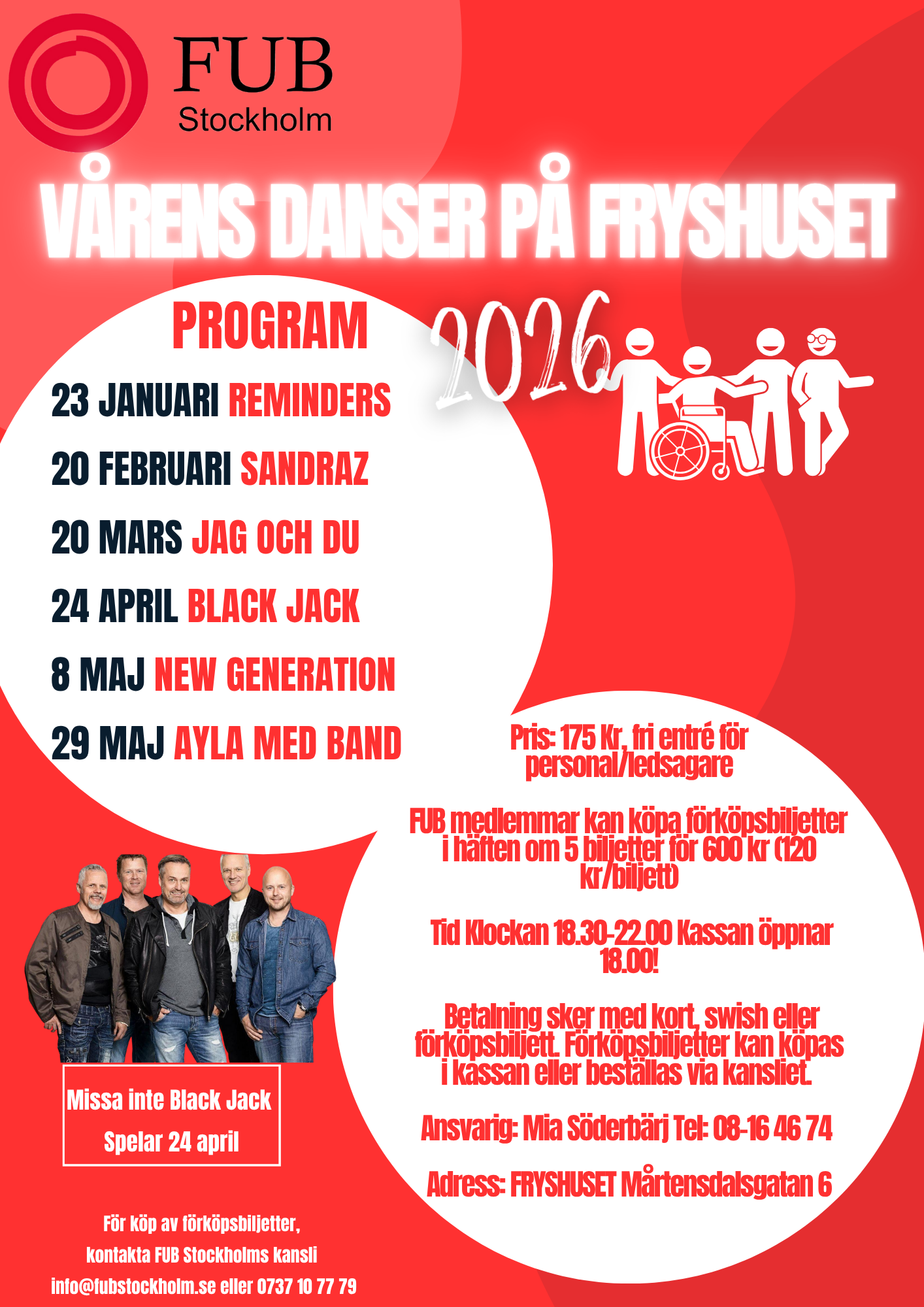 Pris: 120 kr för FUB-medlemmar vid köp av förköpsbiljetter (5 för 600 kr), fri entré för ledsagare och personal och 175 kr för övriga.
